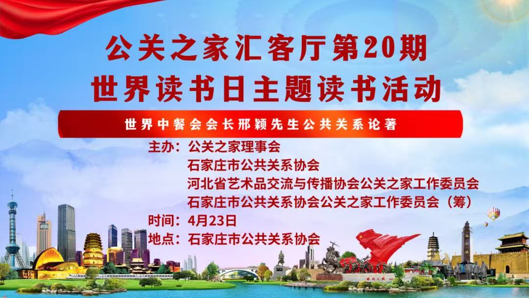 • 4月23日,在第29个世界读书日之际,由公关之家理事会、石家庄市公共关系协会主办,河北省艺术品交流与传播协会公关之家工作委员会、石家庄市公共关系协会公关之家工作委员会承办的学习“世界中餐会会长邢颖先生公共关系论著”普及宣传公共关系知识,分享公共关系实践成果活动在石家庄市公共关系协会举行。公关之家理事会会员企业、石家庄市公共关系协会会员单位以及特邀嘉宾欢聚一堂、续友谊、畅未来,合作共赢,共谋发展。